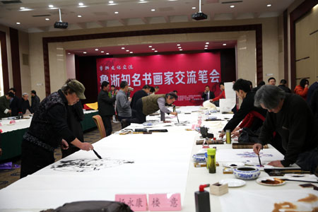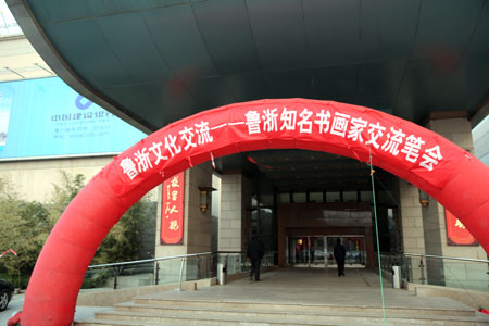 1月11日上午,山東省浙江商會十周年系列活動之魯浙文化交流——魯浙知名書畫家交流筆會在山東大廈開幕,來自浙江和山東的近30位知名書畫家在山東大廈傾情揮毫潑墨。