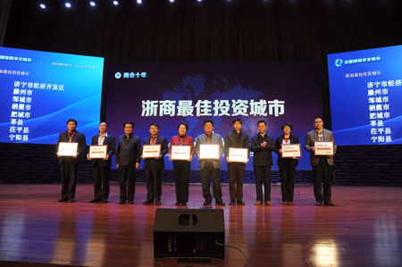 峰會下半場舉行了“商會十年——浙商最佳投資城市” 頒獎。 淄博、聊城、泰安(地級市),滕州市、鄒城市、棲霞市、肥城市、莘縣、茌平縣、寧陽縣、汶上縣、濟陽縣、五蓮縣、沂源縣、煙臺東部海洋經濟新區、東營經濟技術開發區、濟寧任城經濟開發區、濰坊寒亭區等3市15縣(市)區脫穎而出,被評為浙商最佳投資城市。
