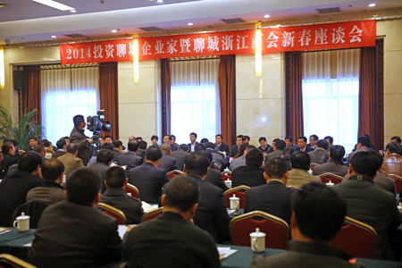 1月13日,2014年投資聊城企業家座談會暨聊城浙江商會新春座談會在聊城市會議接待中心舉行。聊城市委副書記、市長王忠林,市委常委、副市長張旋宇,聊城軍分區原司令員、聊城浙江商會名譽會長李昌平,市政府秘書長馬駿等聊城市領導出席會議。商會執行會長倪士鎮,常務副會長陳躍華,常務副會長、聊城浙江商會會長傅廣偉,常務副會長蔣加良以及聊城浙江商會企業家、部分投資聊城企業家、《浙商》雜志記者參加座談會。