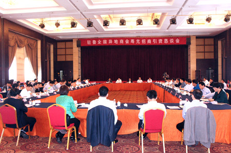 25日上午,考察團(tuán)一行在晨鳴國際大酒店會(huì)議中心與壽光市領(lǐng)導(dǎo)懇談。壽光市委副書記、市長趙旭春致辭,邱旺主持懇談會(huì)并對壽光重點(diǎn)招商項(xiàng)目做推介。