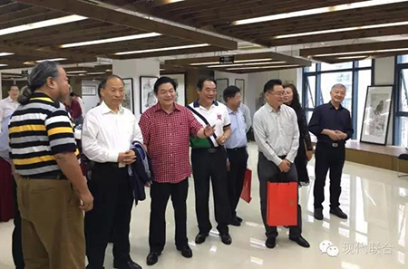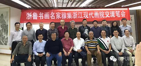 會議結束后,煙臺市政協領導在章鵬飛會長和徐一寧書記的陪同下,來到正在舉行“浙魯書畫名家雅集”的現代畫院參觀,并與在場題詞作畫的山東和浙江兩地書畫名家合影留念。