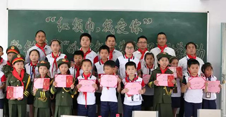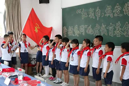 伴隨著莊嚴的升旗儀式,捐贈活動正式開始。在少先隊新隊員入隊儀式上,新入隊的少先隊員戴上鮮艷的紅領巾,莊嚴宣誓并呼號,這一天也將成為他們永遠珍貴的回憶。同時,少先隊員們還為遠道而來的微貸網愛心使者們敬禮佩戴紅領巾,以表達感激之情。