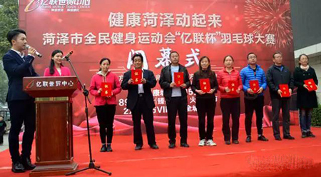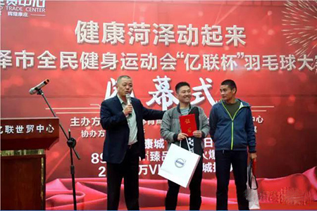 10月15日,由菏澤市體育局主辦、億聯(lián)世貿(mào)中心贊助的菏澤市全民健身運(yùn)動(dòng)會(huì)暨羽毛球大賽,經(jīng)過近一個(gè)月的精彩角逐,圓滿落下帷幕!大賽閉幕式暨頒獎(jiǎng)典禮在億聯(lián)世貿(mào)營銷中心盛大舉行!山東省浙江商會(huì)常務(wù)副會(huì)長、菏澤市浙江商會(huì)會(huì)長、億聯(lián)置業(yè)有限公司董事長包松安,億聯(lián)置業(yè)有限公司副總經(jīng)理陳可兆出席儀式。