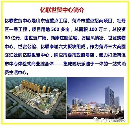 億聯(lián)世貿(mào)中心地處菏澤財(cái)富高地康莊商業(yè)圈,傾力打造100萬方體驗(yàn)式商業(yè)綜合體,是山東省重點(diǎn)建設(shè)工程、菏澤市重點(diǎn)招商項(xiàng)目、牡丹區(qū)一號(hào)工程,項(xiàng)目入市以來即受到社會(huì)廣泛關(guān)注。項(xiàng)目建成后,對(duì)于提升菏澤城市形象、填補(bǔ)菏澤體驗(yàn)式商業(yè)空白、帶動(dòng)社會(huì)就業(yè)與地方經(jīng)濟(jì)發(fā)展將產(chǎn)生重大影響,也必將成為菏澤最具代表性的城市商業(yè)新名片!