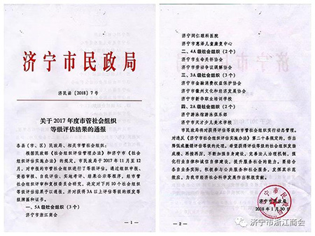 經濟寧市民政局評估,按照《社會組織評估管理辦法》對濟寧市浙江商會基礎條件、內部治理、工作績效、誠信建設、社會評價5大方面進行實地考察和專題調研,濟寧市浙江商會被評為濟寧市首家“5A級異地商會”和“濟寧市先進社會組織”