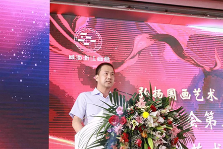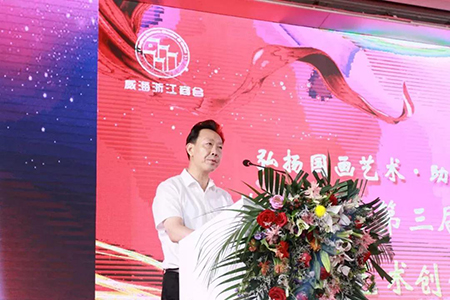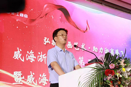 威海市委宣傳部常務(wù)副部長(zhǎng)許祖強(qiáng)為陜西美協(xié)主席王西京先生一行發(fā)表了歡迎致辭。許祖強(qiáng)副部長(zhǎng)致辭中說道,希望此次王西京主席率陜西美協(xié)與威海浙江商會(huì)、山東揚(yáng)夢(mèng)文化公司聯(lián)手的強(qiáng)強(qiáng)合作,能為威海書畫產(chǎn)業(yè)破除發(fā)展瓶頸,夯出一條新路;期待以王西京主席為代表的長(zhǎng)安畫派藝術(shù)家筆下的威海風(fēng)光能夠越來越多的與黃土高原的山山水水一起亮相于國(guó)內(nèi)外的藝術(shù)展覽;期待更多的陜西藝術(shù)家常來威海、多畫威海、住在威海;期待歷來開風(fēng)氣之先的浙江商會(huì)和各位浙商會(huì)員積極地投身文化產(chǎn)業(yè)的發(fā)展,把文化藝術(shù)與自身的業(yè)務(wù)經(jīng)營(yíng)高度的融合起來,讓威海浙商企業(yè)成為威海市民最向往的企業(yè)、讓威海浙商群體成為社會(huì)公認(rèn)的既有經(jīng)營(yíng)才能又有文化才能的城市引領(lǐng)者;期待正在揚(yáng)帆前行的山東揚(yáng)夢(mèng)文化發(fā)展有限公司不斷創(chuàng)新經(jīng)營(yíng)模式,在藝術(shù)社區(qū)建設(shè)和藝術(shù)品經(jīng)營(yíng)方面共享出更多的新型經(jīng)驗(yàn)和發(fā)展成效;期待絲綢之路起點(diǎn)的西安與海上絲路重要節(jié)點(diǎn)的威海攜手并進(jìn),為海洋強(qiáng)國(guó)建設(shè)作出更大貢獻(xiàn)。