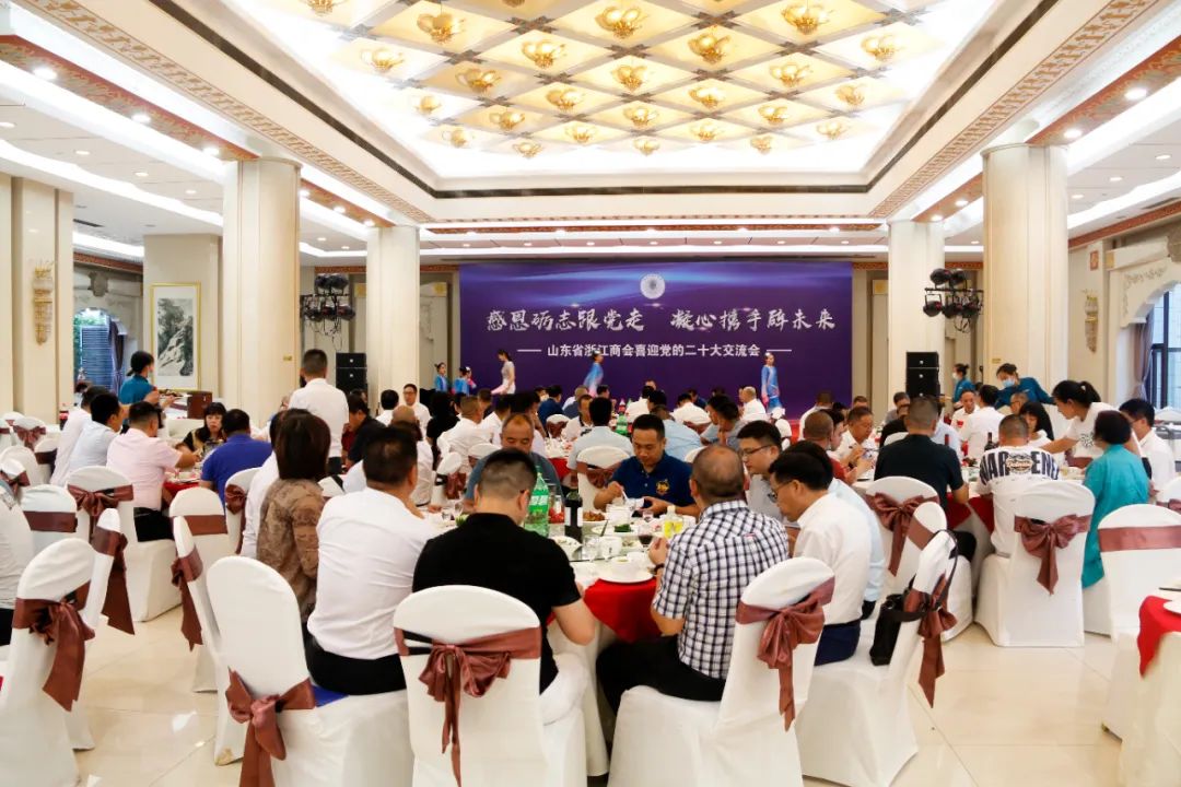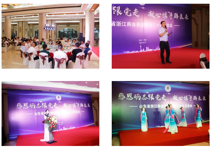 交流會第二階段,山東省浙江商會喜迎黨的二十大交流活動文藝演出,表達(dá)對黨的二十大召開的喜悅之情。山東省浙江商會副會長、山東省浙江青聯(lián)常務(wù)副主席毛繼輝為大家獻(xiàn)上一首自己改編的《浙江人》,表達(dá)了浙商自強(qiáng)不息、攜手發(fā)展,為經(jīng)濟(jì)社會發(fā)展貢獻(xiàn)積極力量,贏得熱烈掌聲。