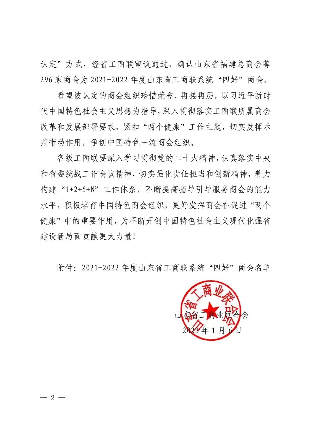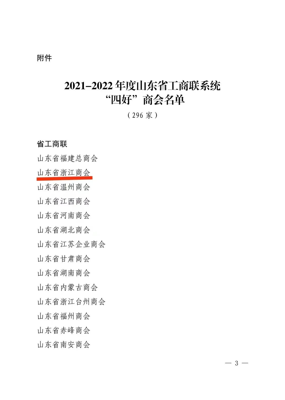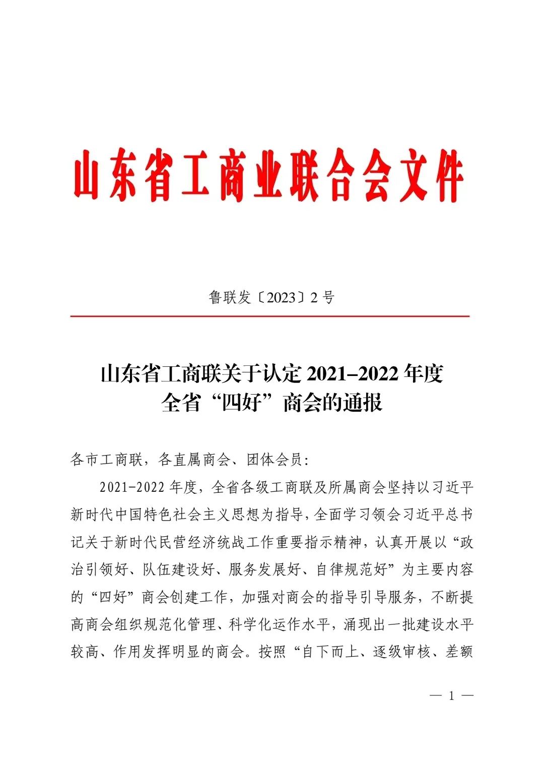 近日,山東省工商聯印發了《關于認定2021-2022年度全省“四好”商會的通報》(魯聯發〔2023〕2號),山東省浙江商會榜上有名。