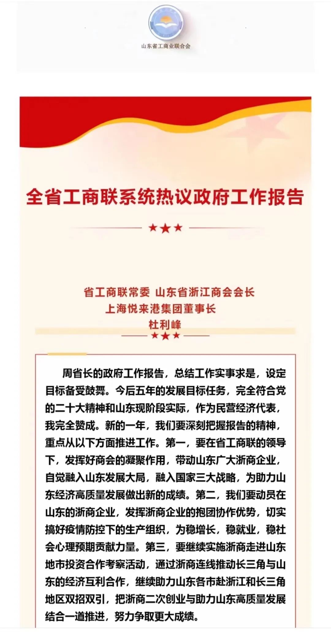 山東省工商聯微信公眾號登載了參加兩會的浙商、