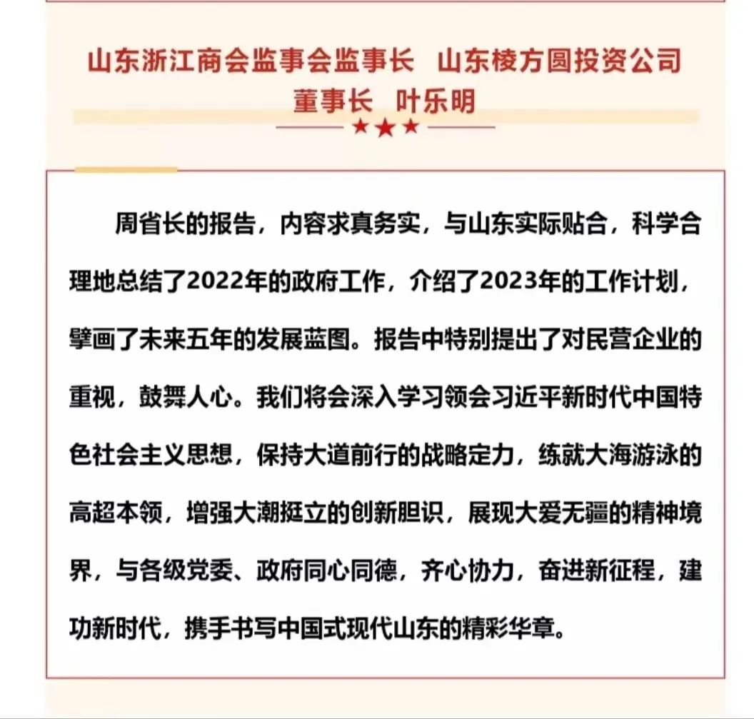 浙江商會會長杜利峰,山東省浙江商會監事會主席葉樂明對工作報告的熱烈反響和心得體會。