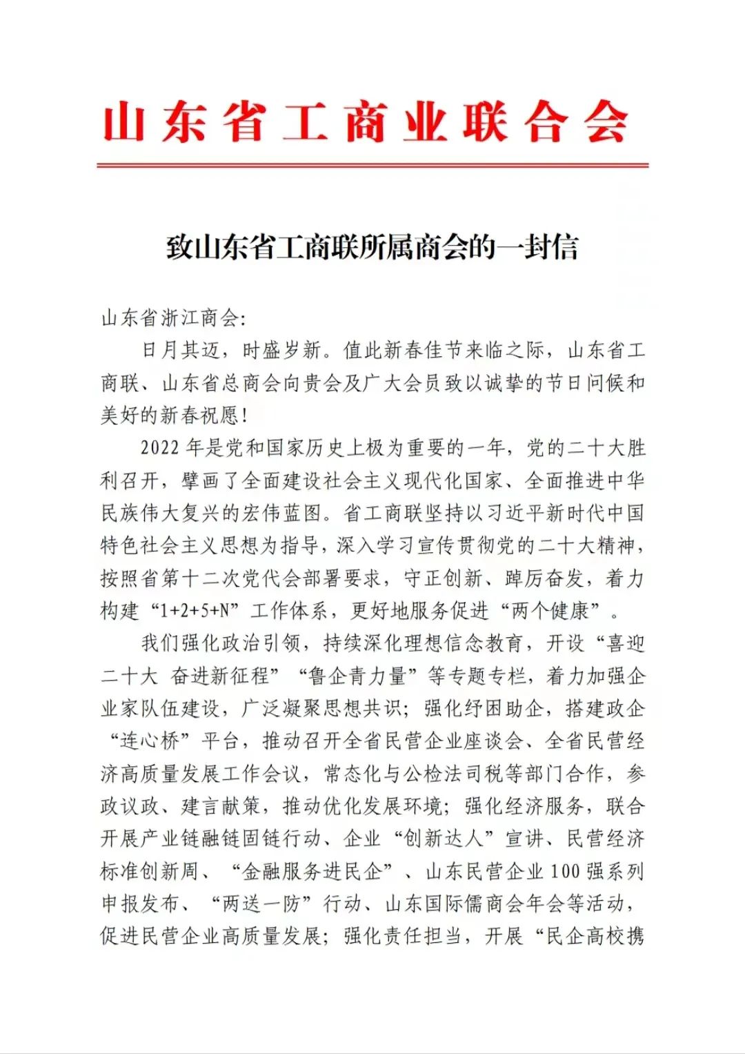 山東省工商聯(lián)、山東省總商會致浙江商會的新春賀信