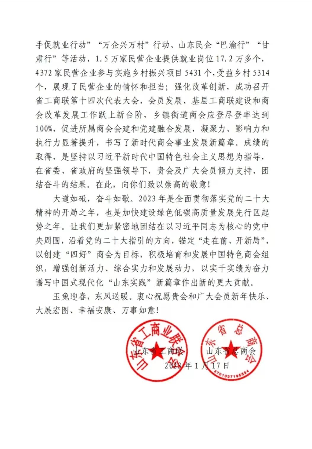 新春佳節(jié)來臨之際,山東省浙江商會榮幸地收到山東省工商聯(lián)、山東省總商會發(fā)來的新春賀信,向浙江商會及廣大會員致以誠摯的節(jié)日問候和美好的新春祝愿!
