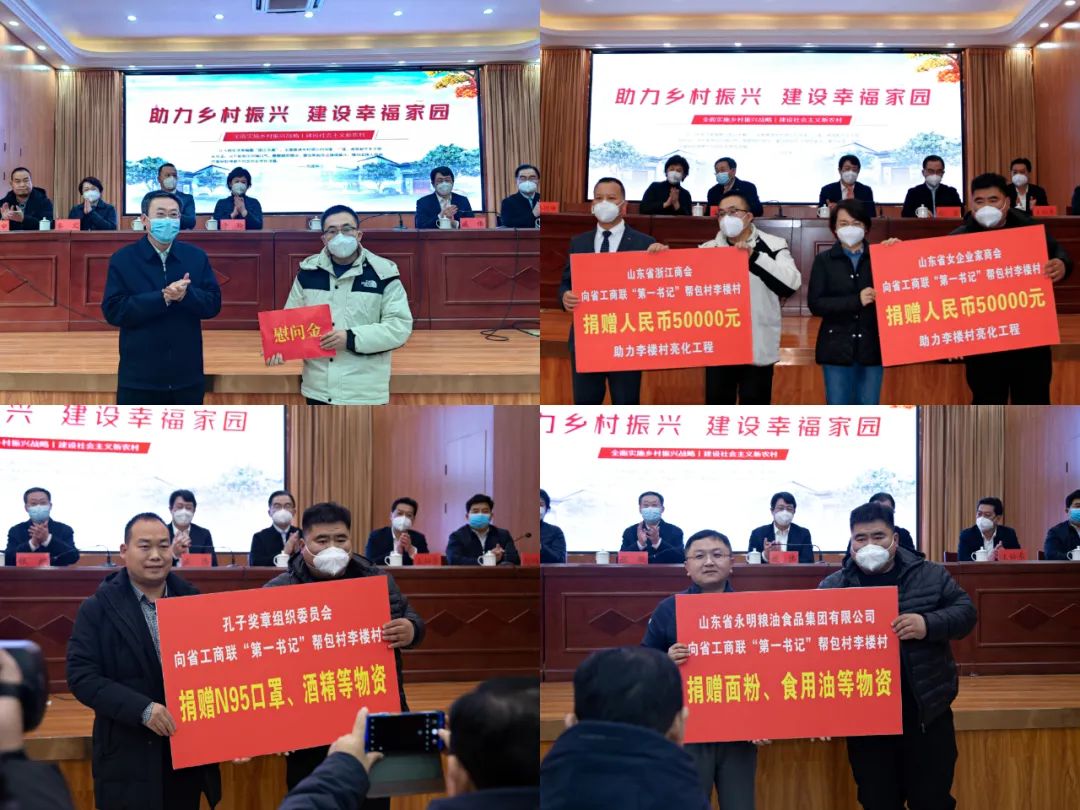 捐贈儀式上,張鯤代表省工商聯向“第一書記”幫包村菏澤市曹縣古營集鎮李樓村老黨員發放慰問金;山東省浙江商會、山東省女企業家商會分別捐款5萬元,用于村莊亮化工程;孔子獎章組織委員會捐贈N95口罩、酒精等防疫物資;山東省工商聯執委企業山東永明糧油食品集團捐贈面粉、食用油等生活物資。