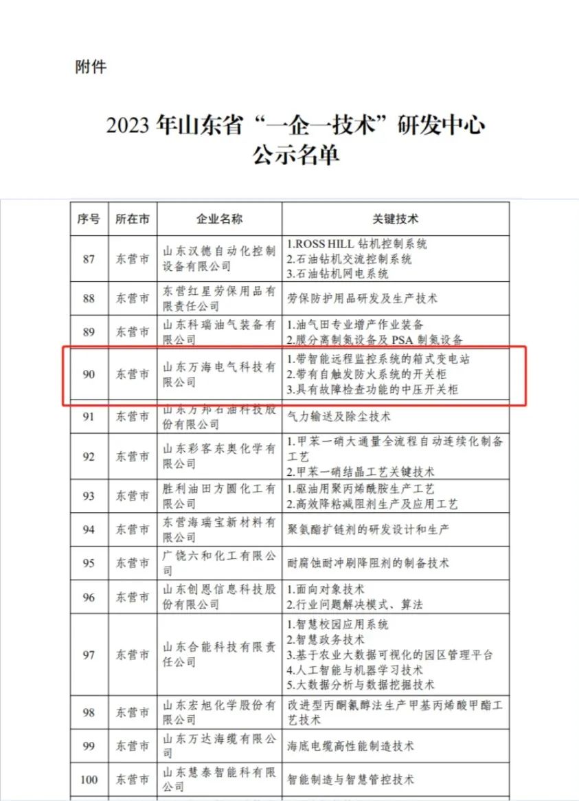 6月15日,山東省工業(yè)和信息化廳公示了2023年山東省“一企一技術(shù)”研發(fā)中心名單,山東萬海電氣科技有限公司關(guān)鍵技術(shù):“帶智能遠(yuǎn)程監(jiān)控系統(tǒng)的箱式變電站”、“帶有自觸發(fā)防火系統(tǒng)的開關(guān)柜”、“具有故障檢查功能的中壓開關(guān)柜”成功入選。