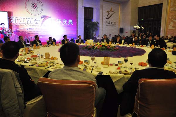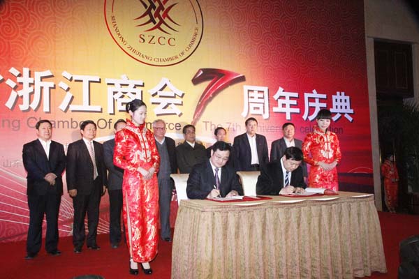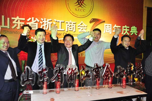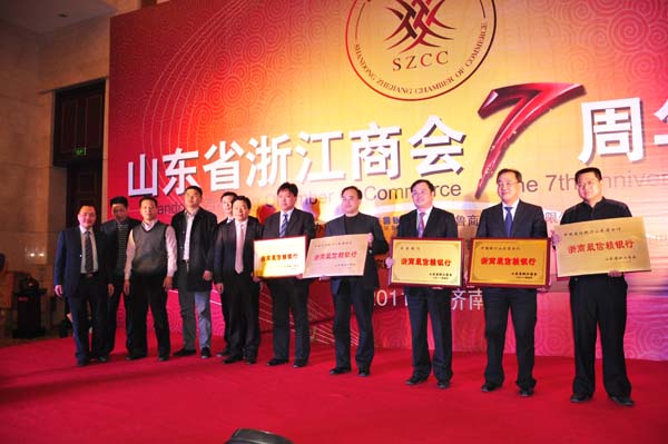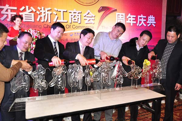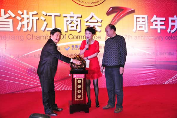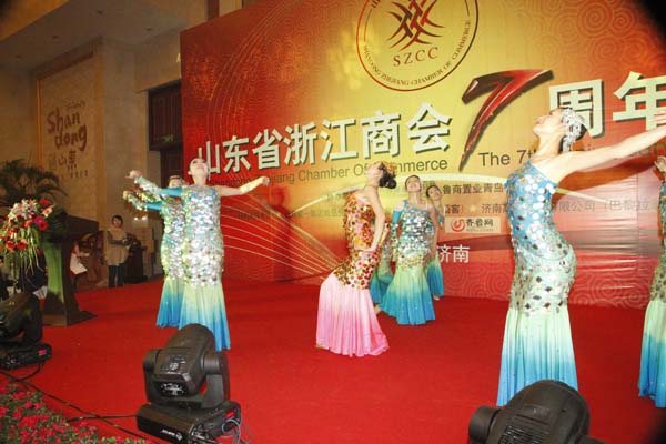 2011年1月22日,山東省浙江商會(huì)成立七周年慶典在濟(jì)南–山東大廈金色大廳隆重舉行。山東省政協(xié)副主席齊乃貴、國土資源部土地咨詢研究部主任潘文燦、省發(fā)改委原主任倪永康、省政府副秘書長張德寬、省委統(tǒng)戰(zhàn)部常務(wù)副部長孫傳宏、山東省旅游局副局長賴征宇等領(lǐng)導(dǎo)出席慶典活動(dòng)。廣大齊魯浙商代表、徽商、閩商、蘇商、陜商等兄弟商會(huì)代表,山東省發(fā)改委、省民政廳、省工商局、省中小企業(yè)辦、濟(jì)南、濱州、萊蕪等地市領(lǐng)導(dǎo),聊城軍分區(qū)、金融機(jī)構(gòu)及各媒體近500人歡聚一堂,共慶商會(huì)七周年。齊魯網(wǎng)對慶典活動(dòng)進(jìn)行現(xiàn)場直播。