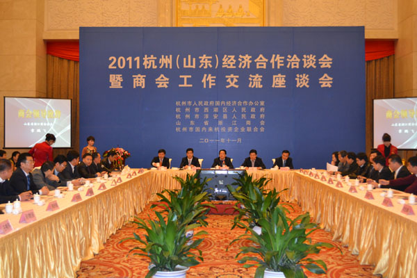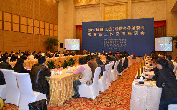 23日下午,2011杭州(山東)經濟合作洽談會暨商會工作交流座談會在山東大廈金色大廳舉行。我會會長章鵬飛,常務常務副會長倪士鎮、陳桂宏、陶光忠,副會長葉蘄萩、陳錫銘、蔣加良、季瑞彩、王哨華、周玲娟、陳重陽、余建權,商會首席顧問顏景海,常務副會長單位外海集團、山東國際商貿港,副會長單位華納集團,商會濟寧、聊城、淄博分會代表,常務理事單位山東海豐水產等會員企業負責人以及常務副秘書長張宗建,副秘書長徐秀梅、楊易成、毛繼輝、羅龍等近60人參會。