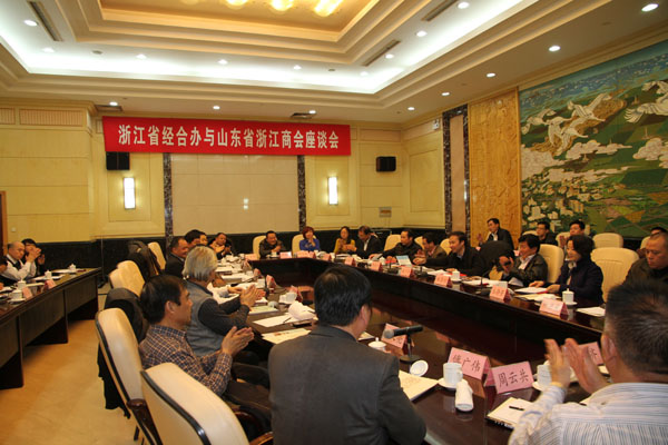 2011年11月30—12月3日,浙江省經合辦姚少平主任一行來山東,就商會建設發展情況、營銷網絡建設情況、浙商回歸發展情況進行調研。浙江省政府辦公廳處長姚粵利、浙江省經合辦聯絡指導處處長吳永平、浙江省經合辦綜合處副處長叢靜芳、浙江省經合辦副調研員潘錫忠等陪同調研。山東省原副省長、我會名譽會長謝玉堂,山東省省長助理、省公安廳廳長吳鵬飛等出席歡迎晚宴。山東省發改委經濟合作處處長宋文杰,合作處尹晶等出席座談會。章鵬飛會長等我會領導與調研組座談并陪同調研浙商企業。常務副會長陳桂宏、陶光忠等30多人參加座談會。