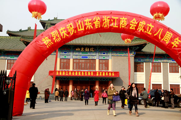 2012年1月7日下午,在浙江商會八周年慶典之際,由中共濟南市委宣傳部、濟南日報報業集團、杭州日報報業集團、山東省浙江商會主辦、會長單位現代聯合集團承辦的大型越劇《紅樓夢》如期在山東劇院演出,劇場內座無虛席,連兩邊走廊里都臨時增加了觀眾坐椅。隨著“林姑娘來了,林姑娘來了”的喊聲,《紅樓夢》的演出拉開了帷幕。山東省政協副主席李德強,山東省政府原副省長、浙江商會名譽會長謝玉堂,山東省省長助理、省公安廳廳長吳鵬飛,山東省政府省長助理周齊,浙江省經合辦副主任鄭憲宏等魯浙兩省領導和工商銀行、中國銀行、建設銀行、交通銀行、齊魯銀行、浙商銀行等銀行以及廣大浙商、各兄弟商會代表觀看了演出。