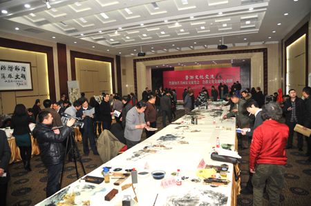 1月12日上午,由山東省浙江商會主辦,齊魯銀行、現(xiàn)代聯(lián)合集團、浙江現(xiàn)代書畫院、山東省政協(xié)聯(lián)誼書畫院、山東畫院、山東致公書畫院、山東省商聯(lián)書畫院、山東九天神馬書畫院協(xié)辦的浙江商會九周年慶典系列活動之魯浙文化交流——魯浙知名書畫家交流筆會在濟開筆。山東省政協(xié)副主席栗甲出席活動并致辭,魯浙兩地30多位著名書畫家現(xiàn)場揮毫潑墨,描繪丹青。我會常務(wù)副會長倪士鎮(zhèn)、金位海、胡小軍、陶光忠,齊魯銀行常務(wù)副行長趙學(xué)金,魯浙知名書畫家代表等出席開幕式。